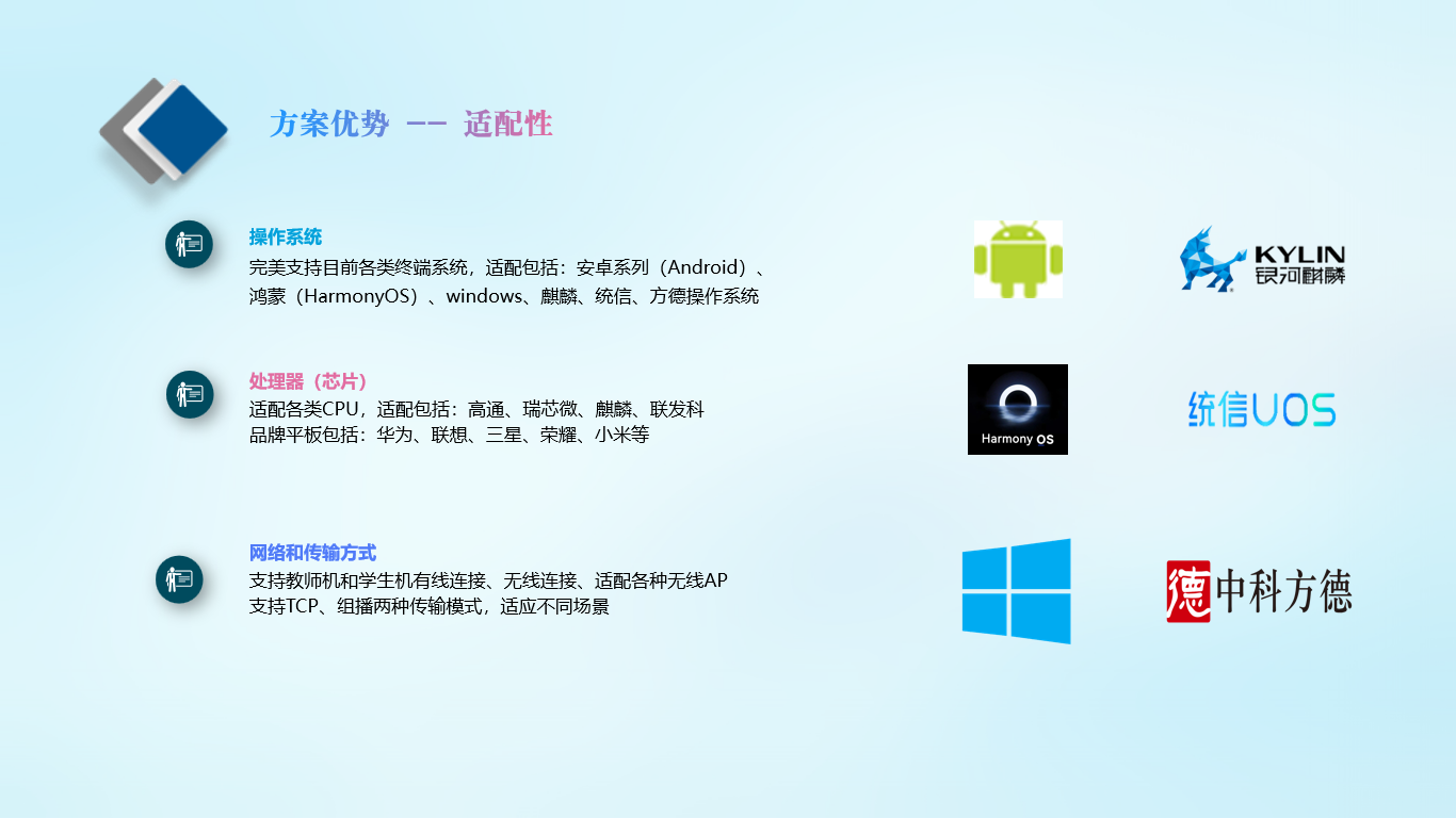 安卓鸿蒙电子教室方案适配高通、麒麟、瑞芯微、联发科等CPU;适配平板品牌包括:华为、联想、三星、荣耀、小米等。软件支持TCP和组播协议,兼容安卓系列(Android10)、鸿蒙(HarmonyOS)、windows、麒麟(Kylin)、统信(UOS)、方德等操作系统。