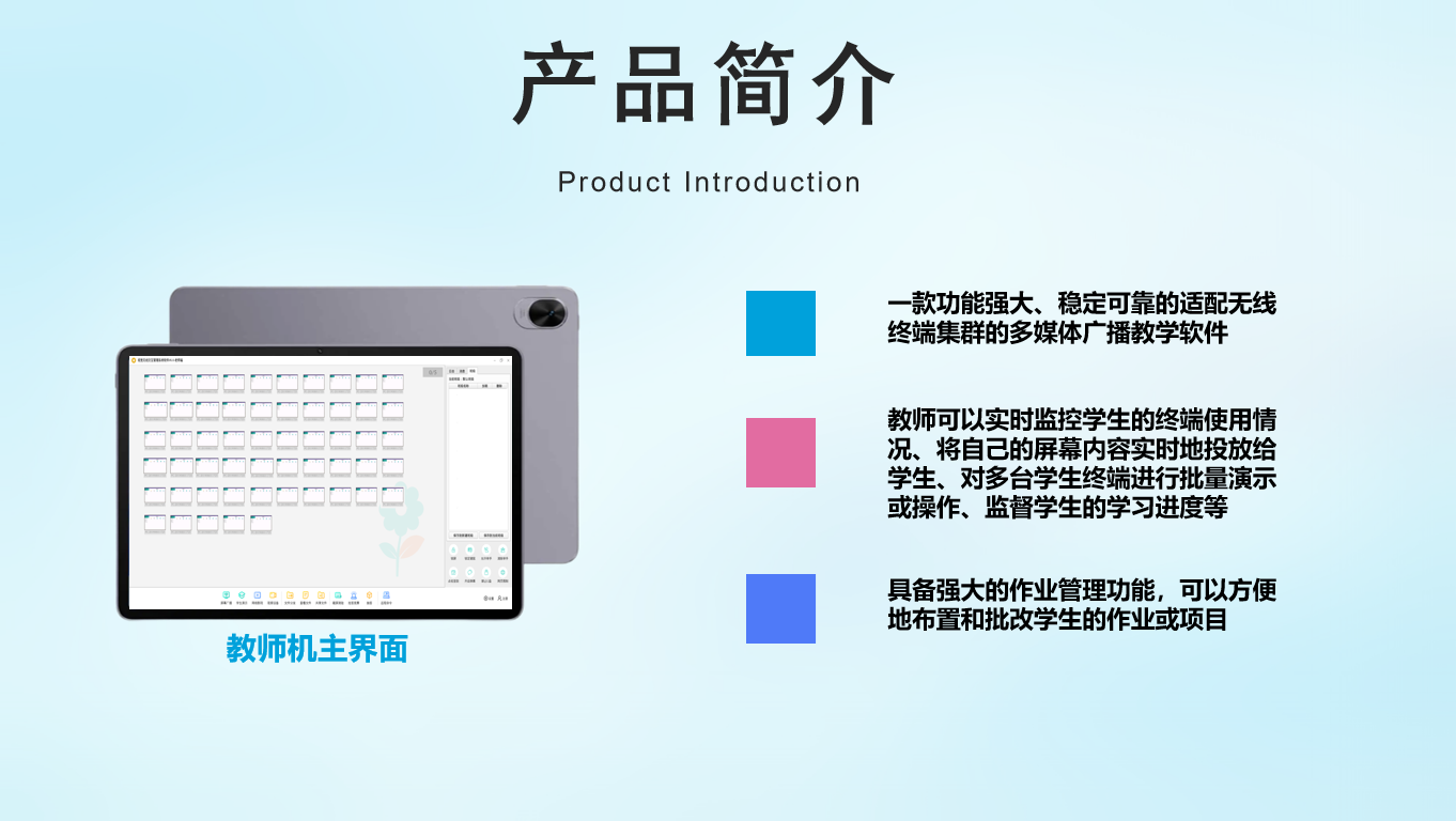 60台无线平板流畅高清广播视频。广播ppt画质清晰。弹幕互动,无线投屏,抢答,抽答等智慧课堂功能。适用平板互动教学,智慧课堂教学,会议等场景。
