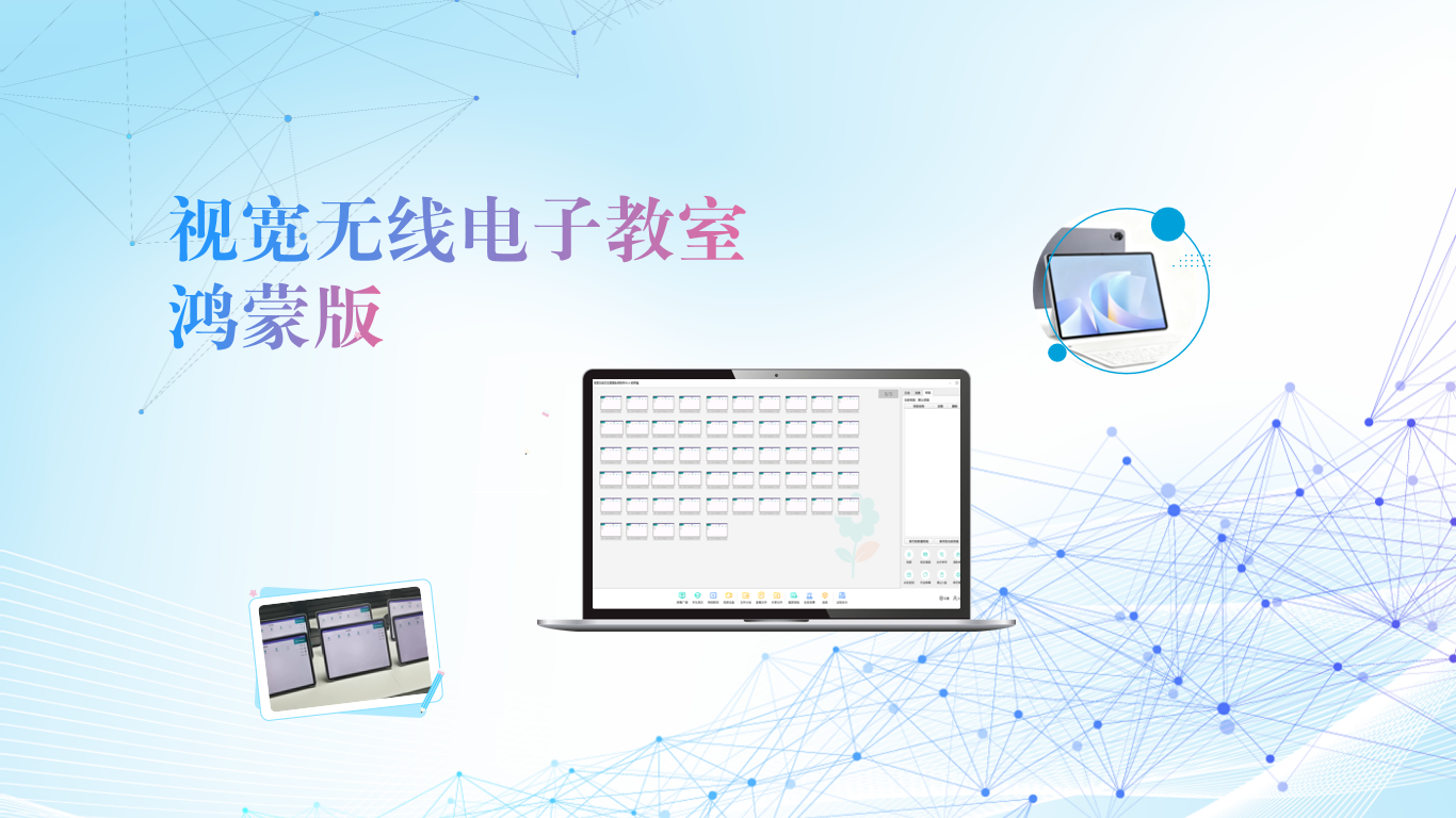 视宽安卓鸿蒙电子教室适配高通、麒麟、瑞芯微、联发科等CPU;适配平板品牌包括:华为、联想、三星、荣耀、小米等。软件支持TCP和组播协议,兼容安卓系列(Android)、鸿蒙(HarmonyOS)、windows、麒麟(Kylin)、统信(UOS)、方德等操作系统,支持各平台的互联互通。60台无线平板流畅高清广播视频,广播ppt画质清晰。弹幕互动,无线投屏,抢答,抽答等智慧课堂功能。适用平板互动教学,智慧课堂教学,会议…...