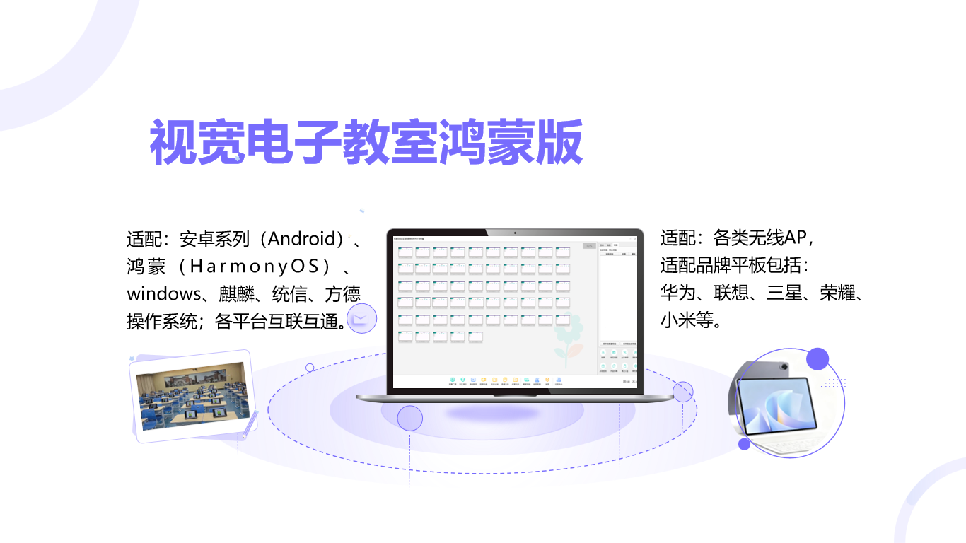 视宽安卓鸿蒙电子教室适配高通、麒麟、瑞芯微、联发科等CPU;适配平板品牌包括:华为、联想、三星、荣耀、小米等。软件支持TCP和组播协议,兼容安卓系列(Android)、鸿蒙(HarmonyOS)、windows、麒麟(Kylin)、统信(UOS)、方德等操作系统,支持各平台的互联互通。60台无线平板流畅高清广播视频,广播ppt画质清晰。弹幕互动,无线投屏,抢答,抽答等智慧课堂功能。适用平板互动教学,智慧课堂教学,会议等场景。
